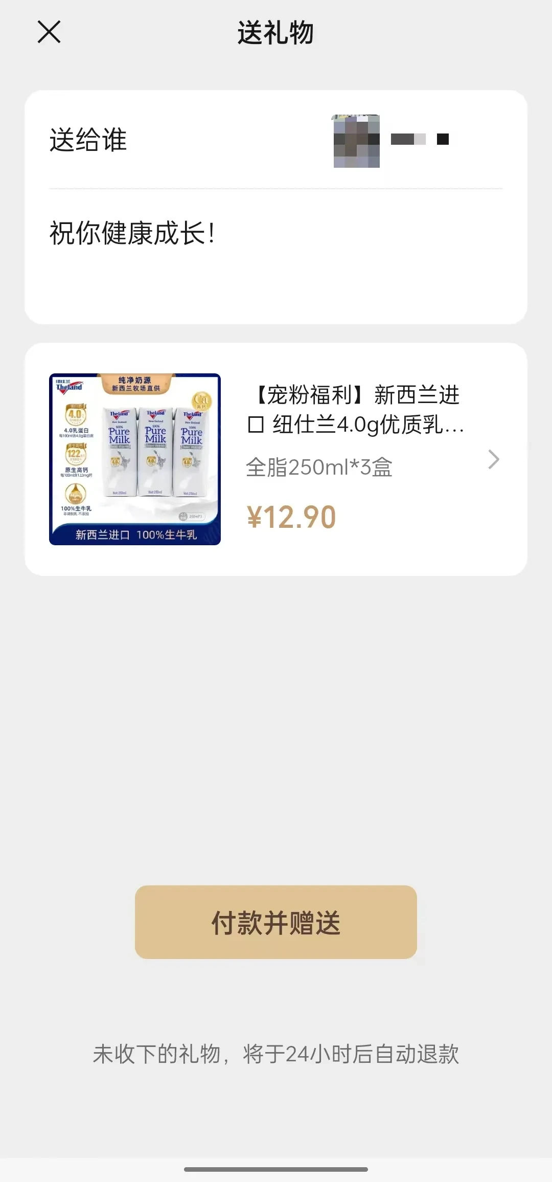 然后选择你要赠送的对象,还能像贺卡一样备注「祝福语」,接着付款完成就可以送给他们啦!