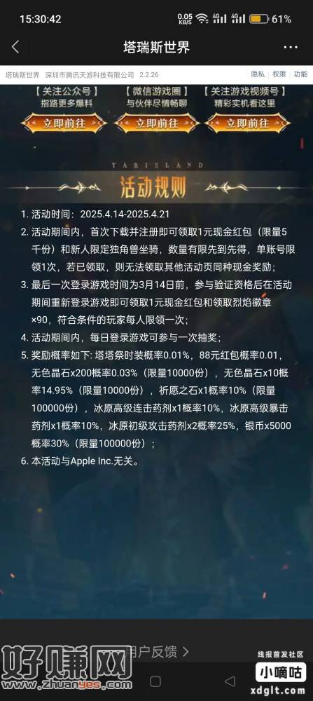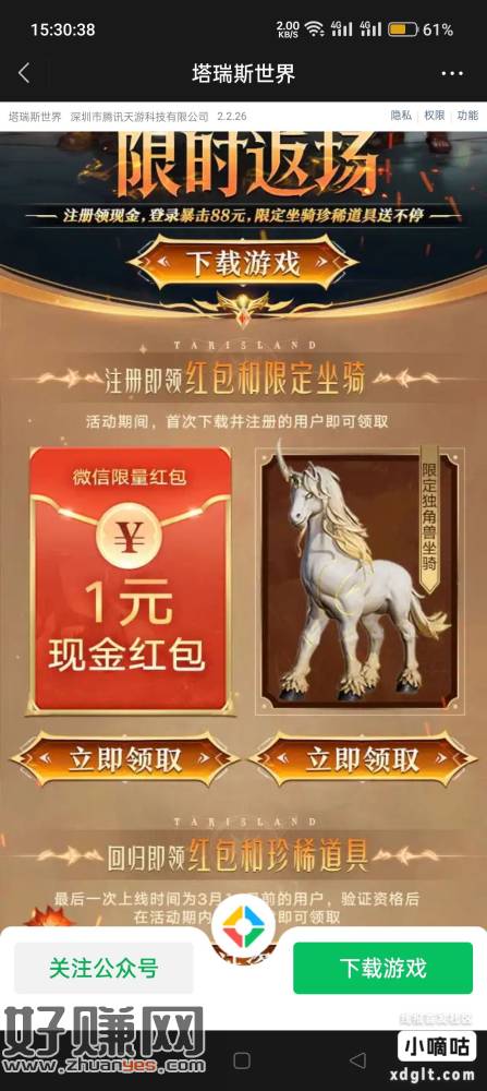 腾讯游戏塔瑞斯世界4月14日注册和回归链接,回归无了,注册自 小伊 04-14 腾讯游戏塔瑞斯世界4月14日注册和回归链接,回归无了,注册自测https://game.weixin.qq.com/cgi-b ... =wx675c6fd66266f0aa¬iceid=144814664¬ice_id=144814664&msgtype=140&interactive=14002&biz_subtype=5256601&from_id=3&share_id=wSGqZhvbSJuBJnQNlo-pjQ#wechat_redirect¬iceid=144814664 上一篇浏览任务中心和下面浏览这个 昨天做过这些任务了又出来了 而且下一篇招商银行app,工银瑞信基金 招财号,动态