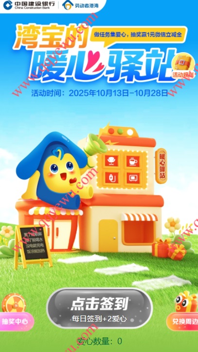 建行劳动者港湾暖心驿站抽1元微信立减金,完成浏览获得爱心,爱心可以抽奖。