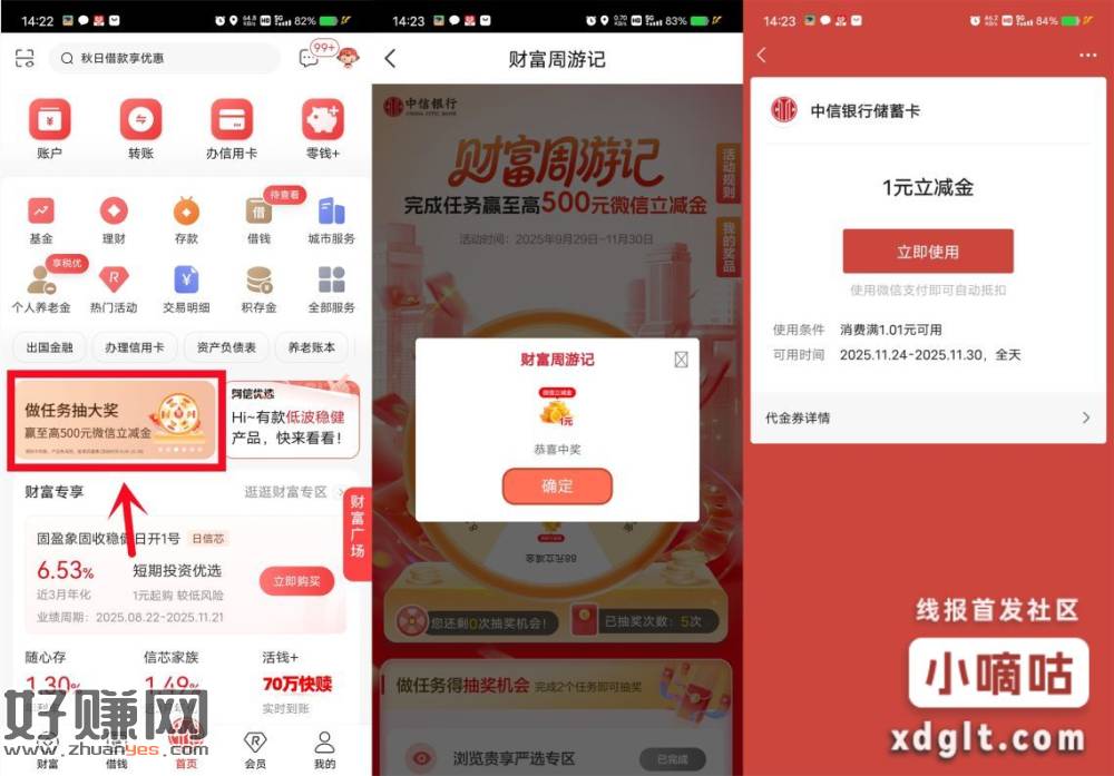 [图片]中信银行抽1-500元微信立减金,注册过二类电子卡的 小伊 11-24 [图片]中信银行抽1-500元微信立减金,注册过二类电子卡的也能去,新一期———打开“中信银行”APP,首页点【做任务抽大奖】进去,完成2个简单的浏览任务抽奖,刚中1元 上一篇建信基金,必中小红包下一篇京东金融APP-xing/用卡还款,邮储数币满4800减20
