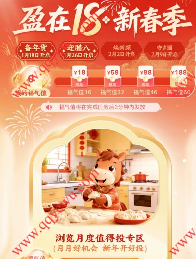 浦发银行盈在18新春季抽最高188元支付宝红包 小伊 01-27 浦发银行盈在18新春季抽最高188元支付宝红包,完成简单任务和定投任务(只要设置定投就行不扣钱),最高188元支付宝红包、体验金,定投的任务再去APP里搜索【定投】进去我的定投终止计划就行 活动时间:2026年1月26日-2月14日 参与方法:打开浦发银行APP搜索【盈在18新春季】参与 上一篇拼夕夕车厘子好价下一篇高.德写评价每天得15亓打车券