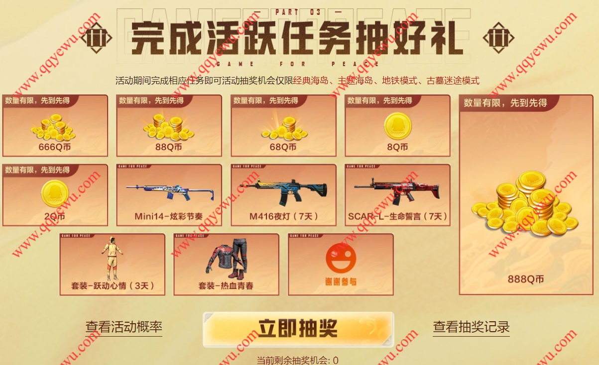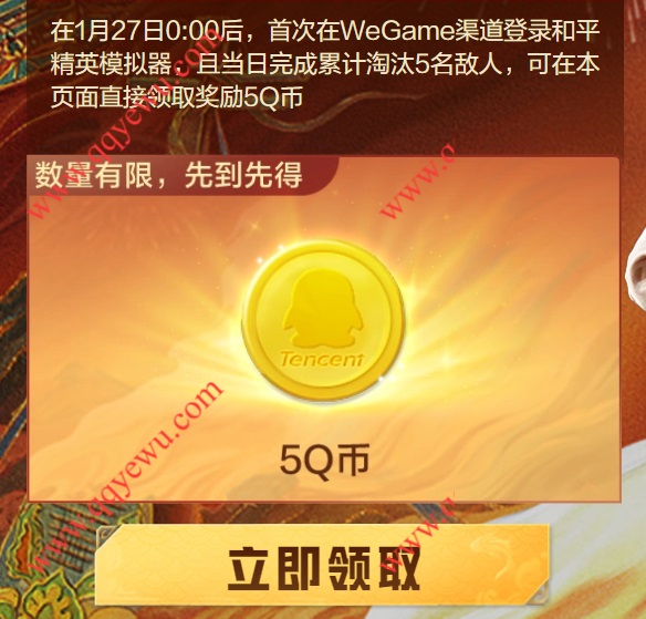 和平精英电脑WeGame渠道抽2-888QB 小伊 01-28 和平精英电脑WeGame渠道抽2-888QB,电脑WeGame渠道登陆和平精英可以领取1次抽奖机会,完成其他任务还可以领取多次抽奖机会 活动时间:2026年1月27日-3月27日 活动地址:https://gp.qq.com/act/a20260112wefareact/云游戏地址:https://start.qq.com/webgame/gamedetail/600527 上一篇招行 红包 3个活动入口,4k份,每个工作日根据涨跌可领下一篇招行 红包,2个888份,每个工作日10点刷新,可收藏