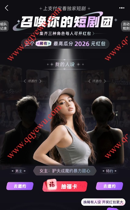 支付宝短剧人设组团每天抽最高2026元红包 小伊 02-04 支付宝短剧人设组团瓜分最高2026元红包,每天3人组团,每天21点抽奖。 活动时间:2026年2月3日-2月15日 参与方法:打开支付宝APP顶部搜索【短剧人设】参与 上一篇目前快手财神点金 必中6.6-888下一篇自己人"打"自己人?微信封杀元宝红包链接