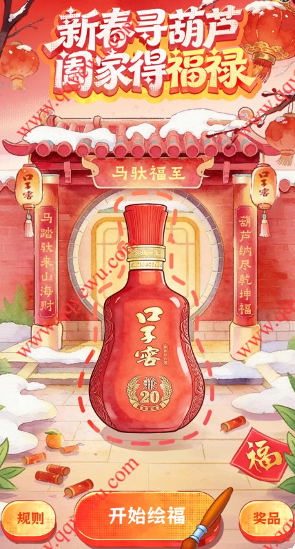 口子窖新春寻葫芦抽1.88-18.88元微信红包 小伊 02-05 口子窖新春寻葫芦抽1.88-18.88元微信红包,每天3次游戏机会,每次游戏有4关,每一关画葫芦都可以抽奖1次 活动时间:2026年2月4日-2月10日 活动地址:http://kzj2026.light.ahhfnk.com/index.php?s=/repo2026/kzjhhl2026/index.html手机扫码参与: 上一篇正新 200份周边去抽试试 ,很卡 感兴趣自己慢慢进下一篇昨天不能买的 今天可以啦哈 ,还送福卡哈