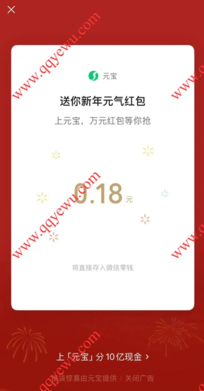 微信聊天发送“元宝”福袋红包 直接到零钱 小伊 02-10 微信聊天发送“元宝”福袋红包 直接到零钱,都可以去试试。 参与方法;打开微信发送【元宝】参与。 上一篇薇诺娜打卡兔费领一片面膜下一篇伊利金领冠变装秀抽0.88-888元微信红包
