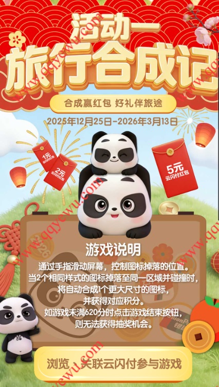 云闪付旅行和成记抽1-5元云闪付红包 小伊 03-05 云闪付旅行和成记抽1-5元云闪付红包,合成游戏到620分结束游戏就可以参与抽奖 活动时间:即日起至2026年3月13日 活动地址:https://unionpay.u-teach.cn/2026CNY/index.html#/home手机扫码参与: 上一篇17点速卡点领17-16 手慢无下一篇支付宝周四福利日抽0.18-5.88元支付红包