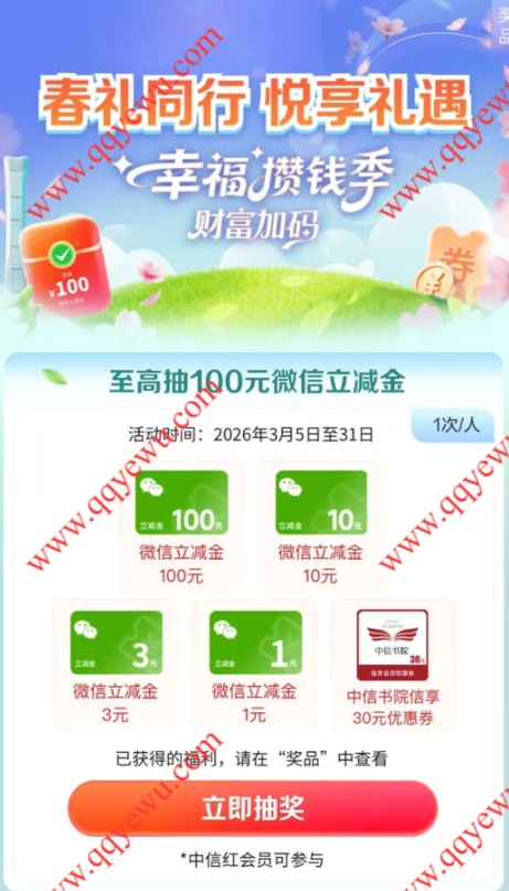 中信银行春礼同行悦享礼遇抽1-100元微信立减金 小伊 03-09 中信银行春礼同行悦享礼遇抽1-100元微信立减金,抽到后需要手动领取秒到 活动时间:2026年3月5日-3月31日 参与方法:打开中信银行APP首页图片【春礼同行悦享礼遇】参与 上一篇工行兴农同享礼抽5元微信立减金 限受邀用户下一篇V打开 工.行湘约有礼 新一期