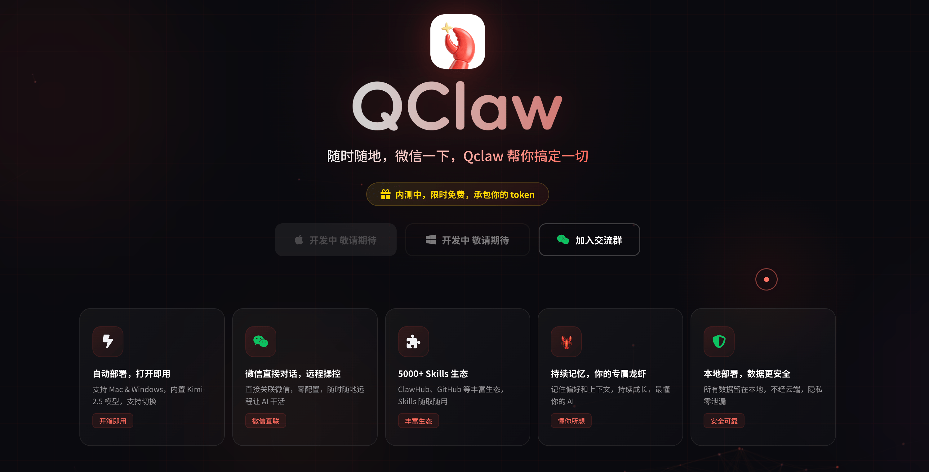 目前产品处于内测限免阶段,尚未开放下载。从官网展示来看,QClaw旨在降低AI使用门槛,将强大的Agent能力融入日常通讯工具,预示着腾讯在个人AI助理与自动化办公赛道上的重要布局。