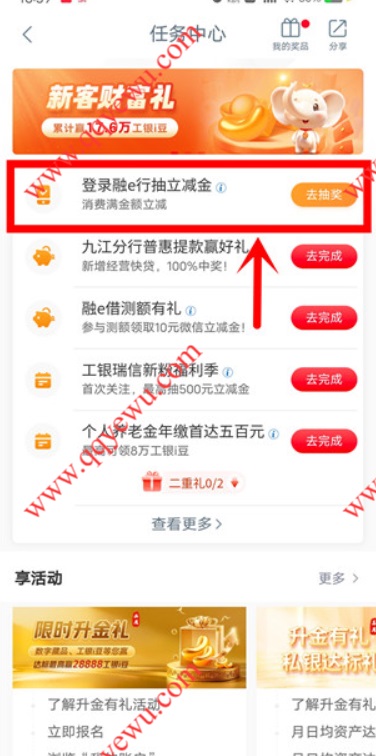 工商银行简单融e行抽5元微信立减金 小伊 03-28 工商银行简单融e行抽5元微信立减金,如果没有入口就参加不了 参与方法:打开工商银行APP搜索【任务中心】进去点【登陆融e行抽立减金】参与 上一篇不管你要奔几都要明白的话下一篇淘宝闪购抢28-18.8外卖蜷