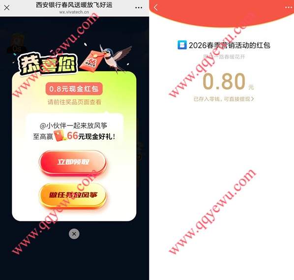 西安银行春风送暖抽最高66元微信红包 小伊 04-02 西安银行春风送暖抽最高66元微信红包,打开推文点击图片参与,小游戏达到8米可以抽奖 活动时间:2026年4月2日-4月8日 活动地址:https://mp.weixin.qq.com/s/f_662EIFeaibeUcV7q356g微信扫码参与: 上一篇邮储银行签约赢好礼抽1.88-8.88元支付宝红包下一篇13:/幸运大转盘,好礼送不停,快来试试手气!!I