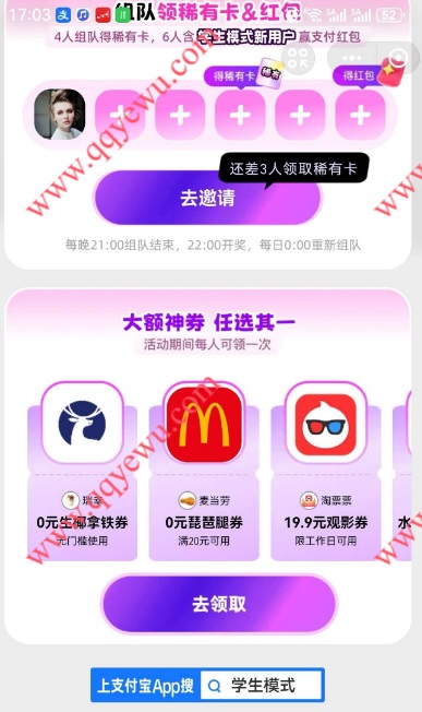 支付宝学生模式0元瑞幸生椰拿铁+0元麦当劳鸡腿等 小伊 04-02 支付宝学生模式0元瑞幸生椰拿铁+0元麦当劳鸡腿等,学生党可以去撸。 参与方法:打开支付宝APP顶部搜索【学生模式】进入后下拉可以看到。 上一篇女生头像清新自然图片_气质森系女生简单头像下一篇大家好,我是log,uc浏览器打卡赢好礼