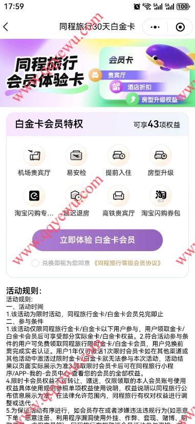 微信限时免费领同程旅行30天白金卡会员 小伊 04-03 微信免费领同程旅行30天白金卡会员,都可以去领下。 参与方法:打开微信APP底部【我的】--【服务】--【火车票机票】--搜索框输入【限时白金】,但是别点搜索,入口就出来了。 上一篇发弹幕b站试试抽 ,发弹幕:4K超清 实力尽显下一篇和包踏春寻趣抽最高2026商城分 可抽2次