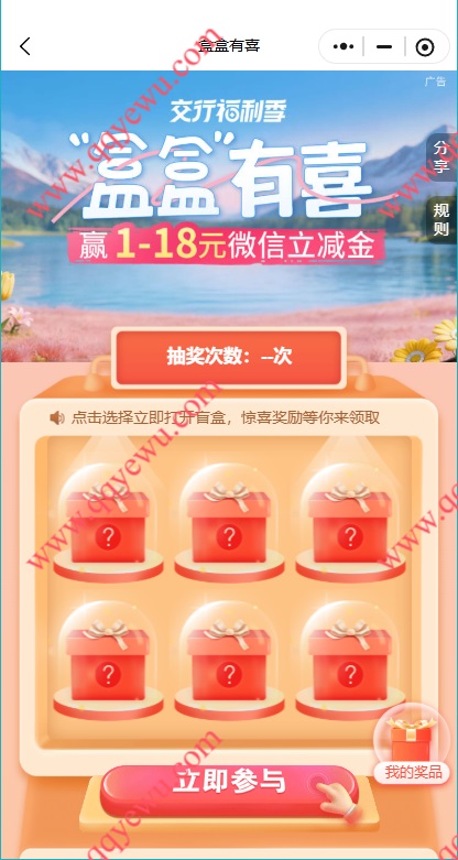 交行盒盒有喜必中1-18元微信立减金 小伊 04-08 交行盒盒有喜必中1-18元微信立减金,比较简单,都可以去参与下。 活动时间:2026年4月8日-4月30日 参与方法:复制【#小程序://交通银行/9pCXexBdNBhrkhb】粘贴到任意微信聊天窗口点击进入中间图片【盒盒有喜】报名参与。 上一篇CoCo 剪刀石头布 ,抽1w份果奶兔单卷下一篇牛乳沙琪玛10包,1.1