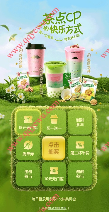 爷爷不泡茶抽免单券,18元无门槛优惠券等 小伊 04-14 爷爷不泡茶抽免单券,18元无门槛优惠券等,打开活动就可以抽奖。 活动时间:2026年4月1日-4月30日 活动地址:https://ali.xudankeji.com/play/nynt手机扫码参与: 上一篇中国移动灵犀发口令抽1-9元话费加赠券下一篇zfb月礼抽3万份6亓鸿包