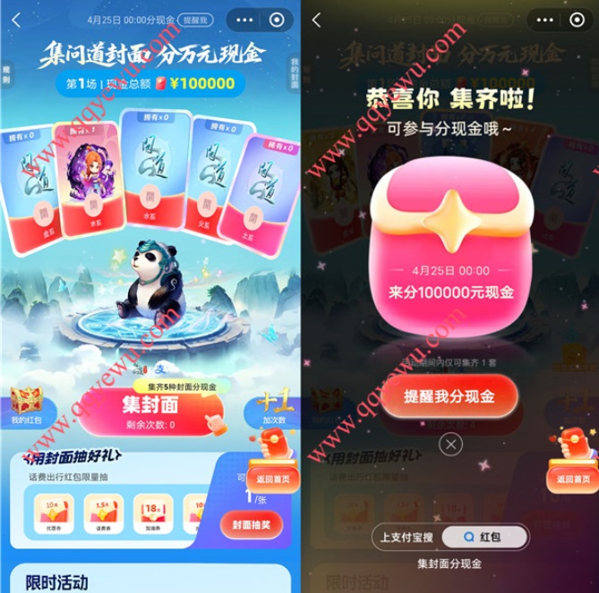 支付宝集问道封面瓜分10万元现金红包 4月25日瓜分 小伊 04-23 支付宝集问道封面瓜分万元现金红包,进入后可以先领1个随机金额的红包,再去集封面活动完成浏览任务抽封面,集齐5个不同的封面合成后可以在4月25日0点瓜分10万元现金红包 参与方法:打开支付宝APP顶部搜索【问道二十周年】参与 上一篇工行页面任wu有随机包 不bi中下一篇带光的微信头像图片_独特品味向阳头像大全