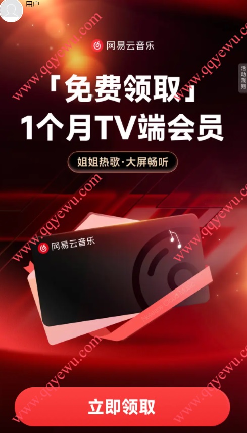 免费领取网易云音乐TV端会员1个月 小伊 04-26 免费领取网易云音乐TV端会员1个月,都可以去参与下。 活动时间:即日起至2026年4月30日 活动地址:https://y.music.163.com/g/yida/8ea3965768894093b678d17af8a9adfd?market=mgtv手机扫码参与: 上一篇和平精英4月新老用户抽2-188元微信红包下一篇网商银行10-0.58去还信用卡,手续费0.1,净赚0.48