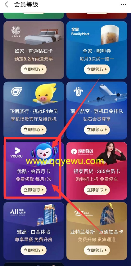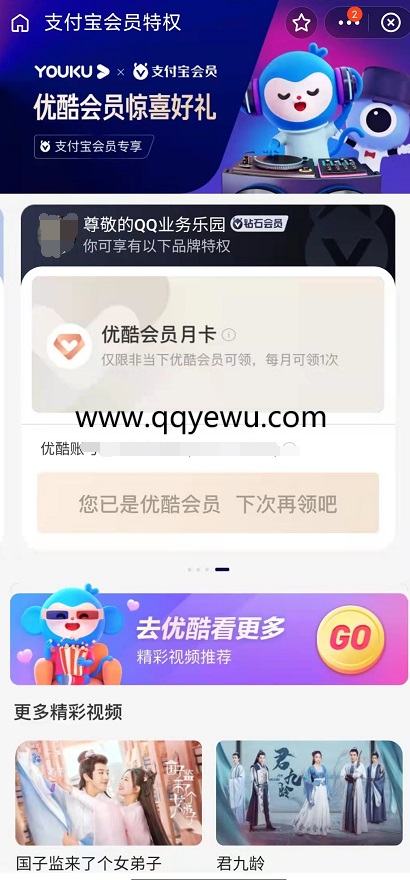 支付宝钻石会员每月免费领优酷VIP月卡 自动采集 10-15 支付宝钻石会员每月免费领优酷VIP月卡,只要等级够的赶紧去,不要白不要,如果是优酷会员领不了。 活动时间:每个月都能领 参与方法:打开支付宝APP我的--支付宝会员--更多特权--往下拉可以看到【优酷会员月卡】进入领取。 上一篇淘宝冲刺淘气值 88元开通88vip享众多会员特权下一篇京东金融15理财日答题瓜分88万小金库现金 可提现