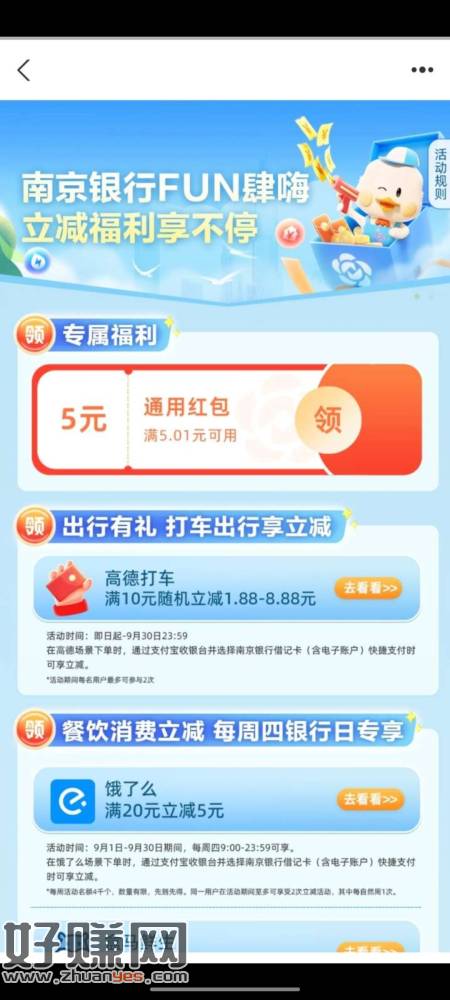 有南京银行卡的,去支付宝搜"南京银行日"5毛
