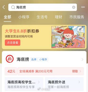 支付宝搜海底捞有200-42支付券,可叠加账号券
