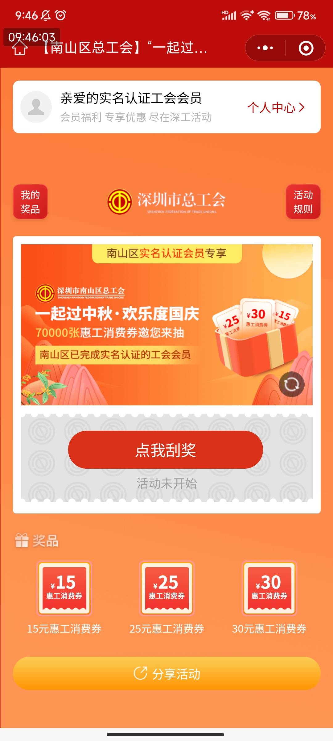 活动时间2023年9月19日至2023年10月9日活动对象南山区实名认证工会会员参与方式活动期间,进入活动入口,符合活动要求的会员,登录后即可参与抽奖。先到先得,领完即止!奖品设置※所有奖品须在中奖后7天内进行兑换/填写资料,否则将失效(视为自动放弃)。15元惠工消费券、25元惠工消费券、30元惠工消费券【奖品有效期】有效期至2023年11月30日【使用方式】①抽奖后,可点击页面“我的奖品”进行查询及兑换②从“我的奖品”-“领取”到微信卡包【使用方式】①抽奖后,可点击页面“我的奖品”进行查询及兑换②从“我的奖品”-“领取”到微信卡包奖会员依据商户号行业划分,在可支持微信支付在指定的区域和行业商家消费时,消费实付款满券面要求金额,在付款时出示个人微信付款码或者扫描商家收款码即可自动抵扣。链接如下↓#小程序://深工活动/9se6RmvHjnO7eIk