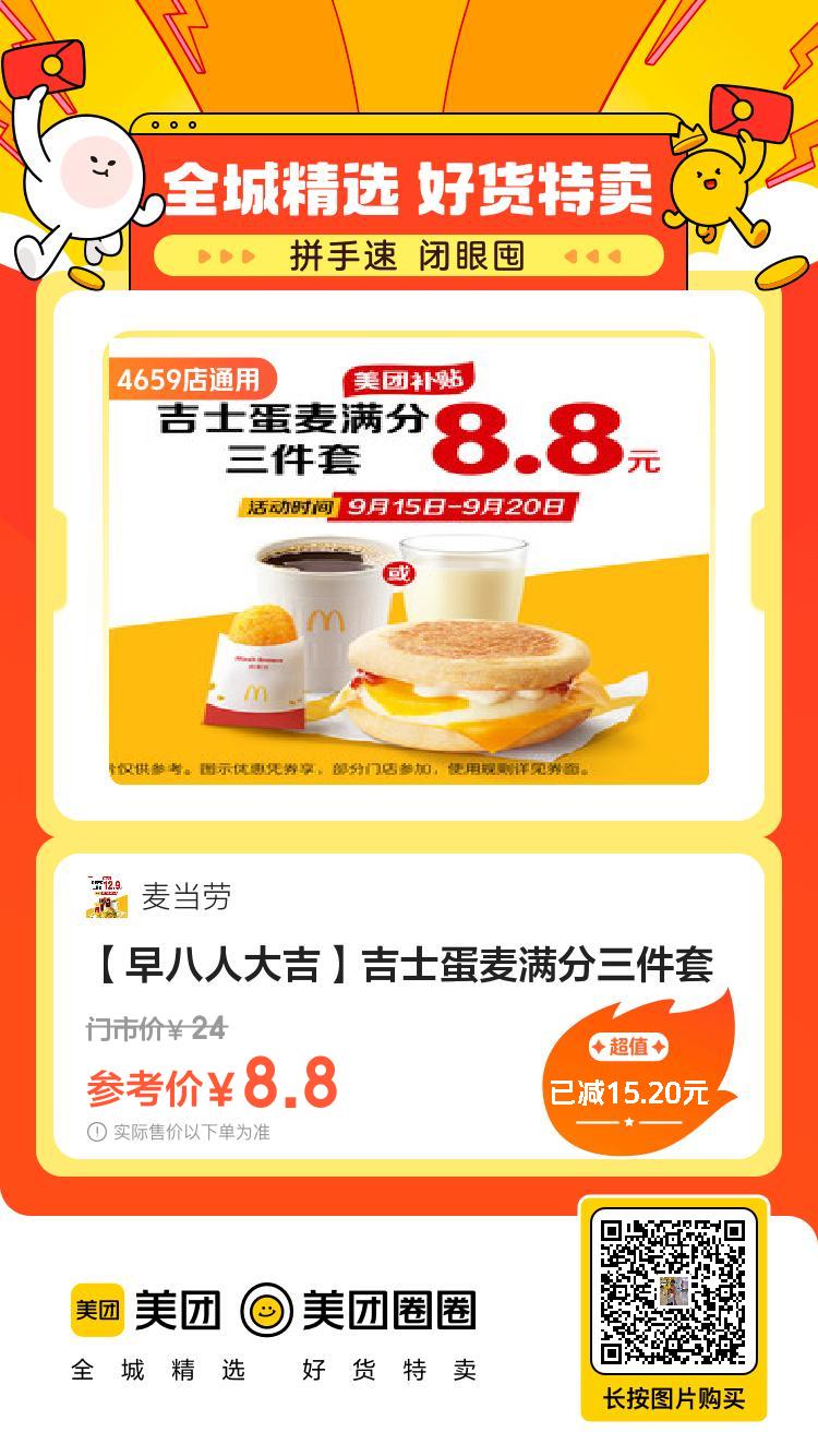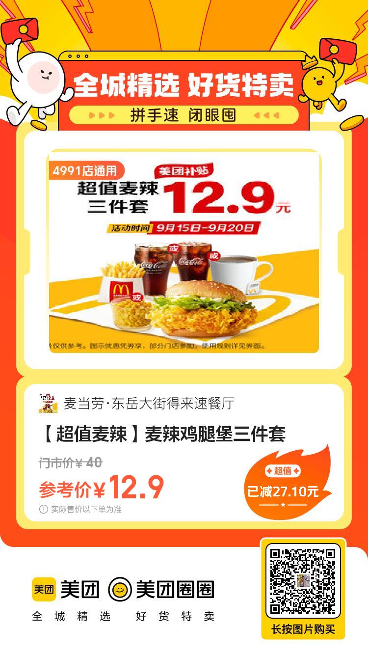 美团到店,麦当劳单人三件套12.9,早餐三件套8.8 小伊 09-20 美团到店,先囤上,过期自动退12.9 麦当劳|【超值麦辣】麦辣鸡腿堡三件8.8 麦当劳|【早八人大吉】吉士蛋麦满分9.9 luckin c|【超值必囤】爆款 20 选 1 上一篇中国银行bobo鱼塘每个月可以兑换一次50微信立减金下一篇安徽邮储支付宝200-100随机没卡,图片来自内部,有卡,每天蹲