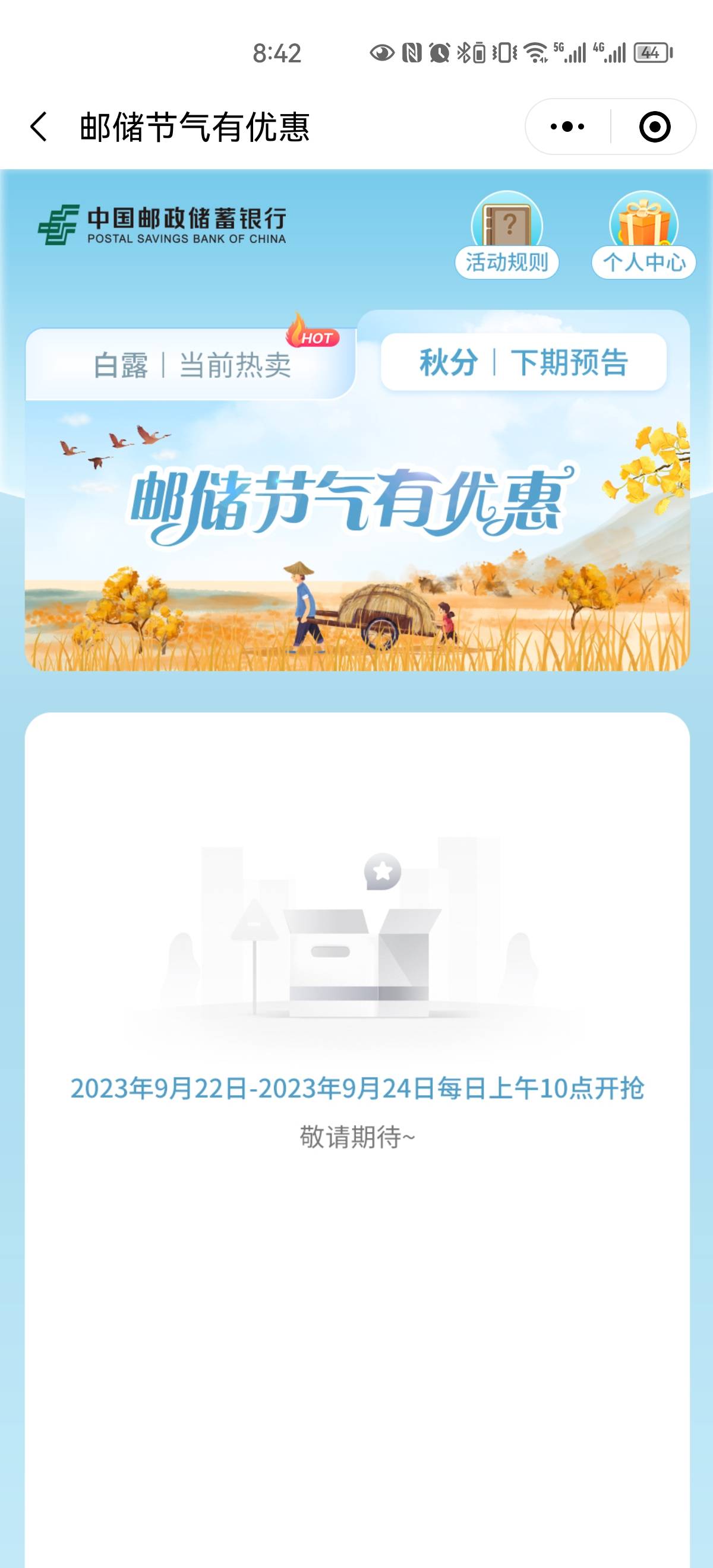 22-24干活动预告:邮储好礼汇小程序 秋分节气秒杀 每天10点卡点 小伊 09-21 22-24干活动预告:邮储好礼汇小程序 秋分节气秒杀 每天10点卡点 老哥们记得去 上一篇老农飞陕西咸阳,代码自己查,每天10点抢20e卡。需要陕西号码,没陕西下一篇山东青岛有三个活动可以玩一下,我低保4毛