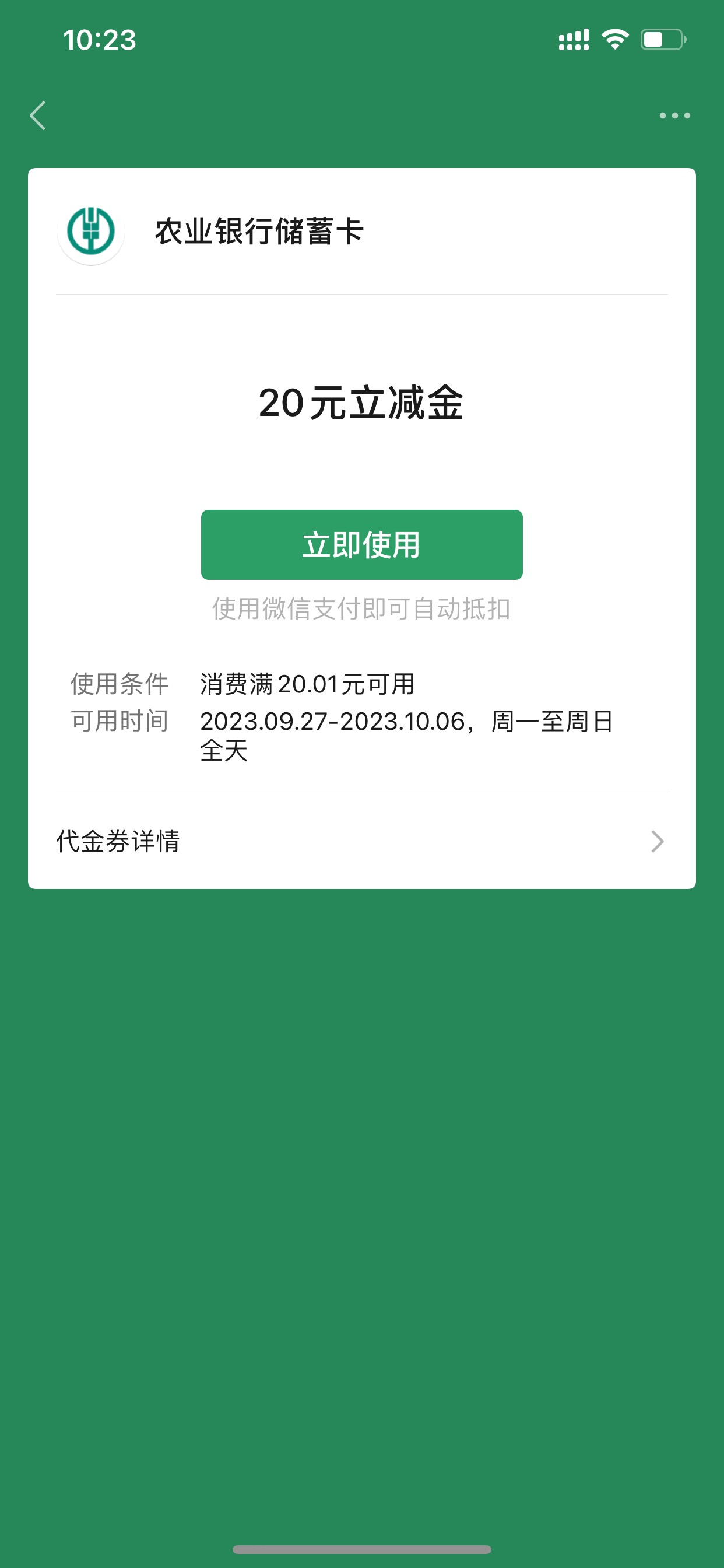 [ 江苏农行 ]盐城农行送您20元微信立减金!即日起至9月30日,登录农行 小伊 09-27 【江苏农行】盐城农行送您20元微信立减金!即日起至9月30日,登录农行手机银行→城市专区→红包多多拿不停→“农”情九月客户回馈活动领取权益,微信支付选“盐城农行储蓄卡”享满立减20元,详询盐城农行各网点。退订请回TD#JS。 特邀代码104009 上一篇中国移动app,快去答题得99话费下一篇湖南农行校园两个活动10毛,需要湖南手机号,活动点不动的清楚数据换个湖
