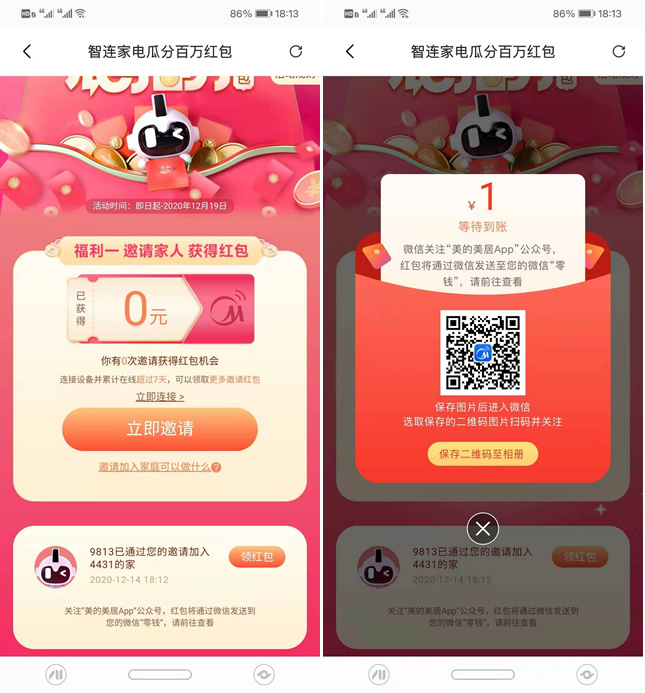 应用商店下载美的美居APP 登陆后首页中间智连家电瓜分百万红包 进入有一次邀请机会