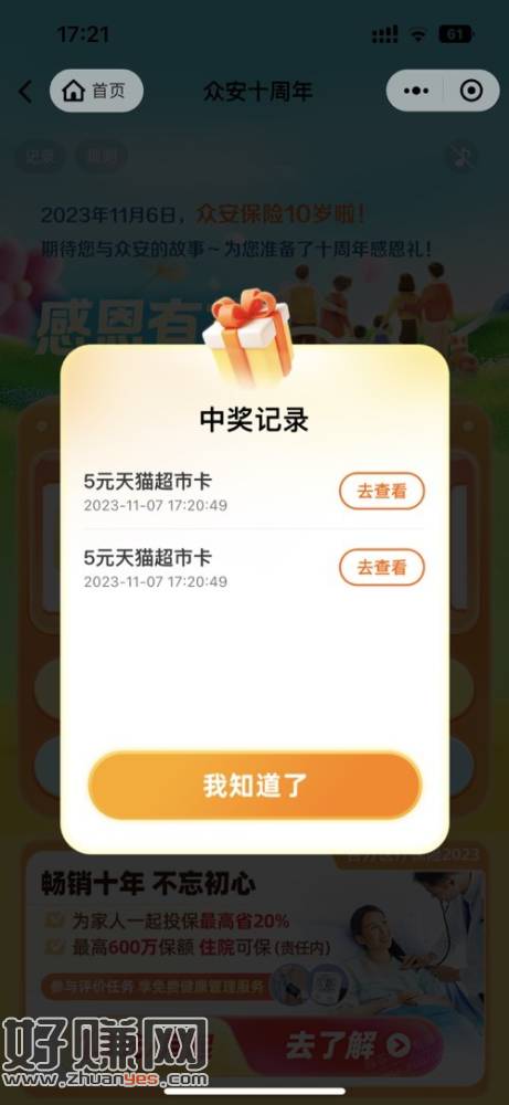 速度 猫超卡10 小伊 11-07 微信小程序【众安保险】进去点顶部图片“众安十周年送60000份感恩礼”进去可以抽奖2次,假分享还可以再抽2次 亲测中5亓猫超卡 毛巾微信众安小程序,小水 - 线报酷 上一篇众安保险小程序众-我的-健康金-健康金抽大奖下一篇交通银行社区横幅,秋季投资园游会