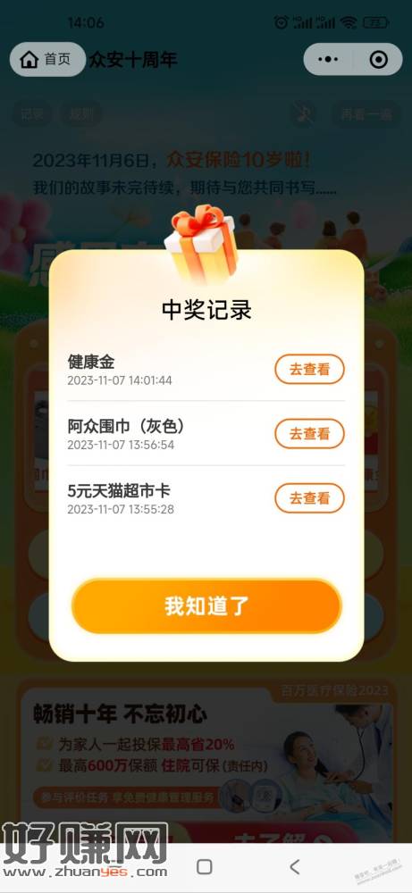 众安保险首页十周年,可以抽,一个号中了5元天猫卡还有实物围巾,另一个号没中,自测