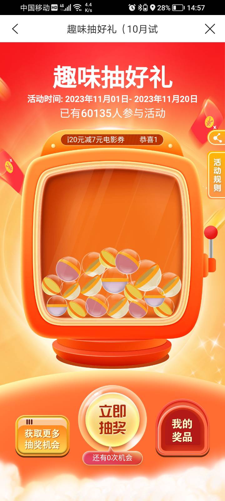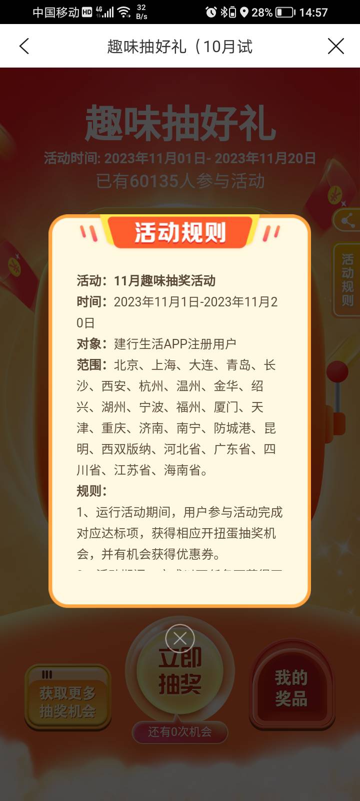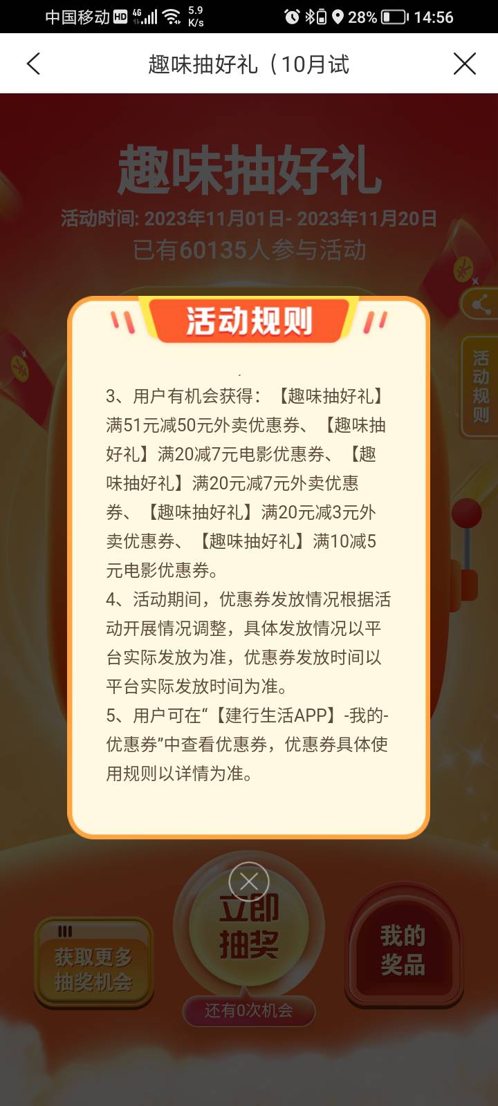 建行生活-热门活动-扭蛋抽好礼。最高51-50外卖卷。