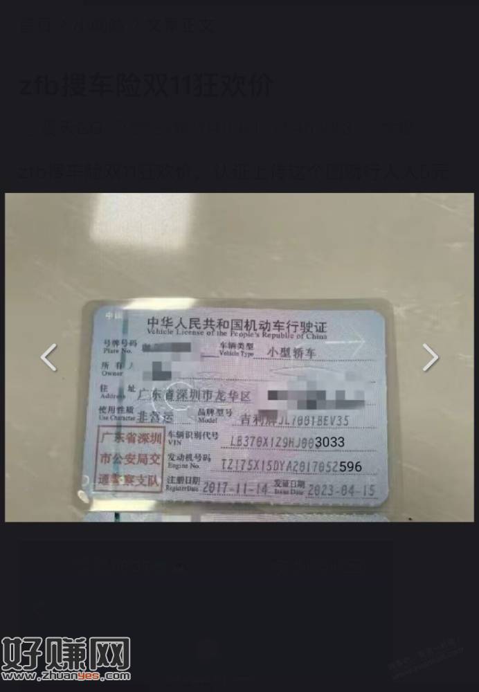 zfb搜车险双11狂欢价,认证上传这个图就行人人5元,车牌乱