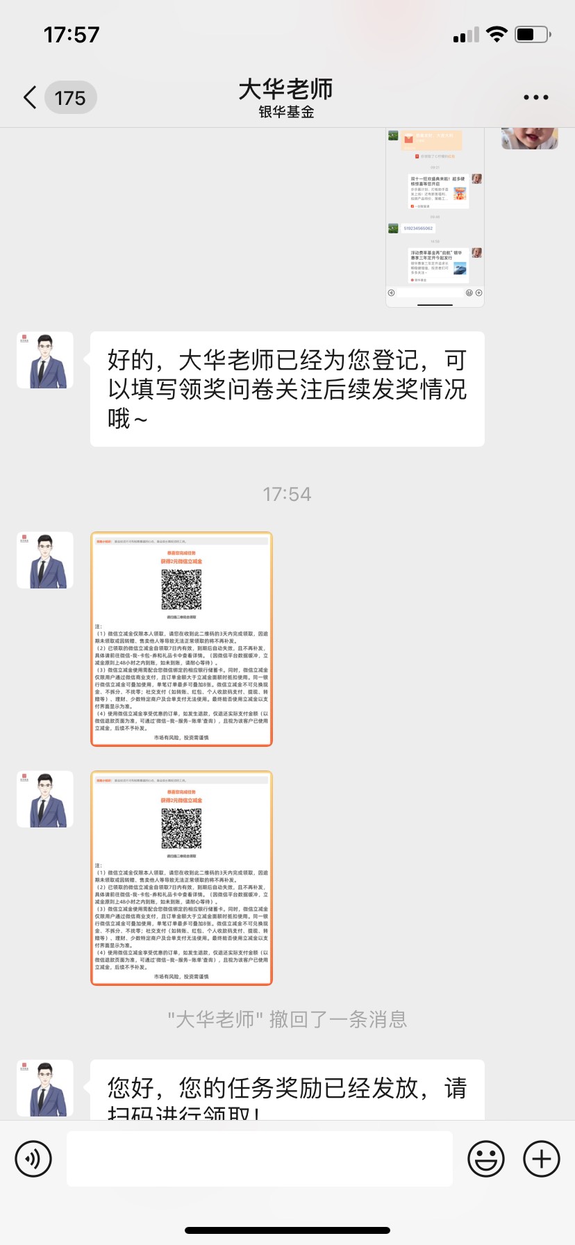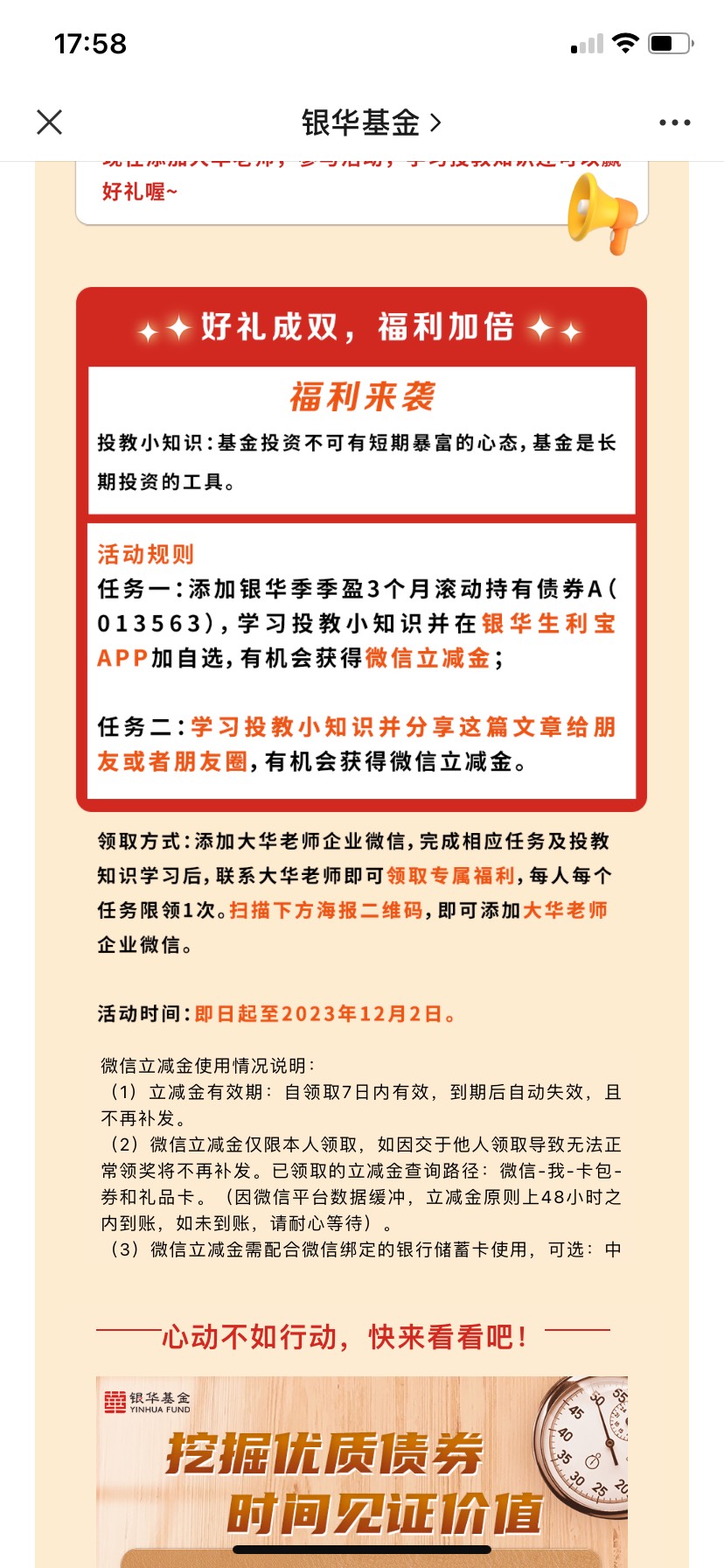 银华基金公众号-第二个推文-添加客服两个简单任务4毛立减金