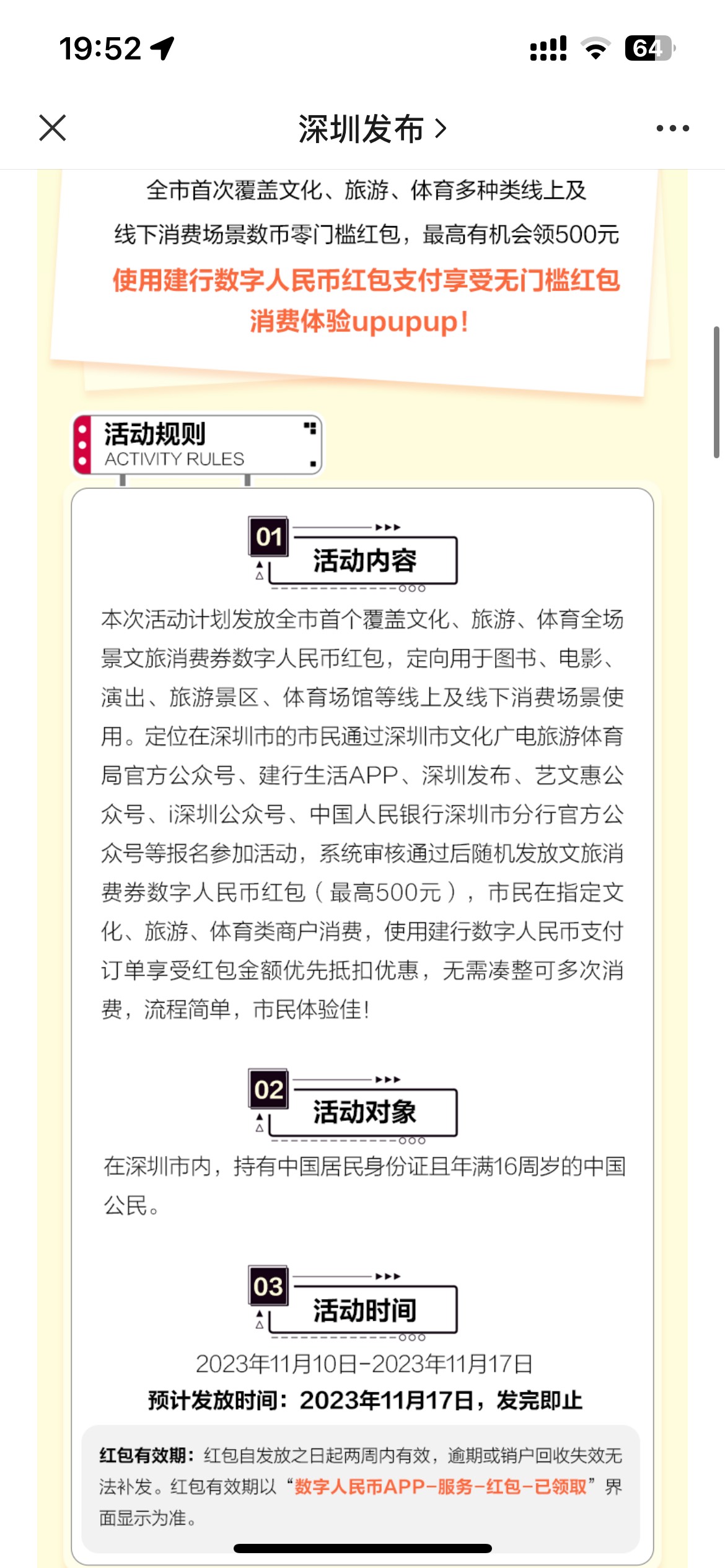 深圳发布公众号推文,深圳市文体惠民数币消费券活动 小伊 11-10 深圳发布,今天最新文章。明天这个活动开始了,没有写具体报名时间,有可能是12点以后或者明天早上10点。最高500数币,这个就是全深圳电影院可以用的数币了。 上一篇好价李施德林漱口水下一篇农行300大毛直接报名吧