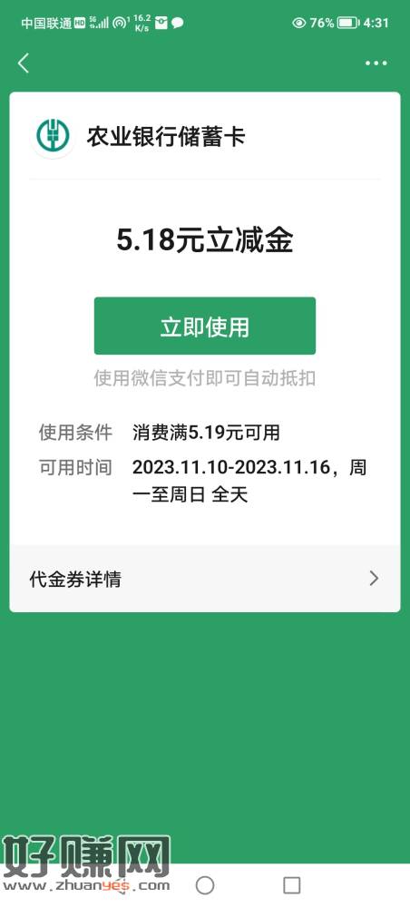 [ 江苏农行 ]最后两天!最高88.88元双十一购物津贴免费领~ 小伊 11-10 【江苏农行】最后两天!最高88.88元双十一购物津贴免费领~农行掌银赠您5.18元-88.88元微信立减金,助力您的购物狂欢!请于11月11日24点前,点go.abchina.com/k/7oI 登录掌银领取,无需验证码。名额有限,先到先得!退订请回TD#JS。 上一篇江苏农行 链接 go.abchina.com/k/7ol最后一位是下一篇必得2元立减金 仅限山东电信 其他省忽略