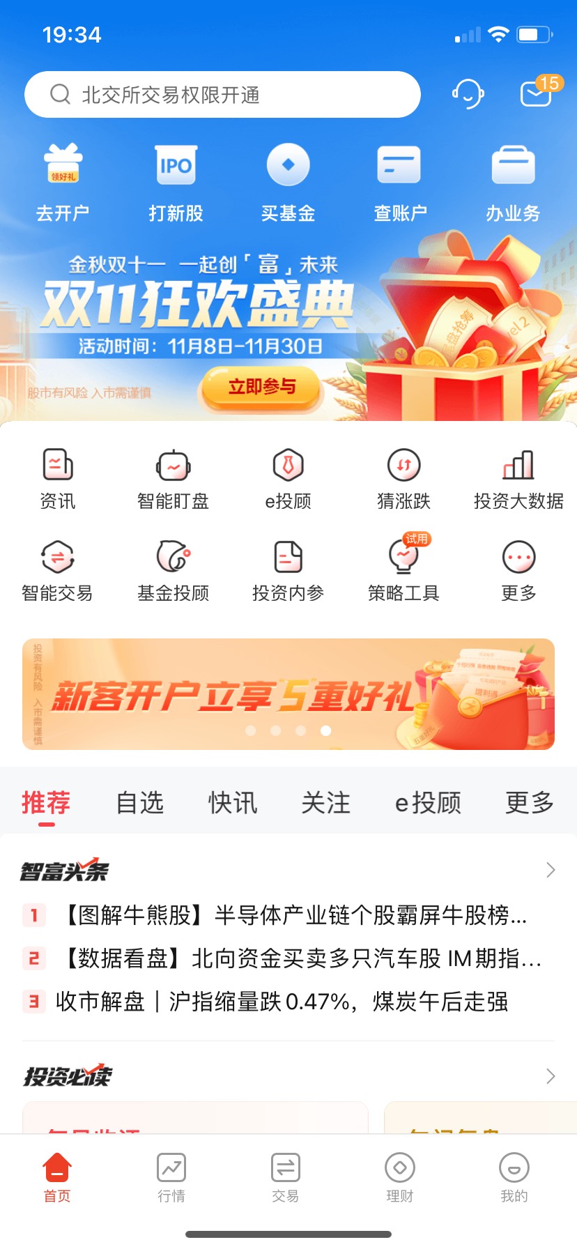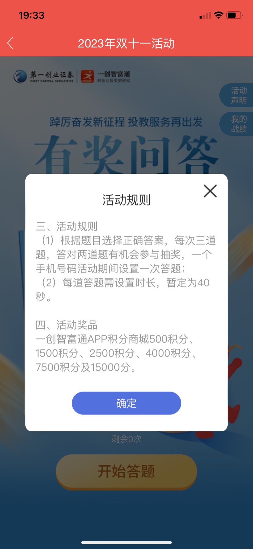 一创证券app双11狂欢盛典有奖问答活动 小伊 11-10 一创证券APP首页 双十一狂欢盛典 拉到最下面答题赢积分好运的去 我中了1500 现在积分换卡券5折 上一篇京东加码水了 两个号都是11.11 快下一篇淘宝主会场19:40-20:10超级红包-限时加码红包1.2