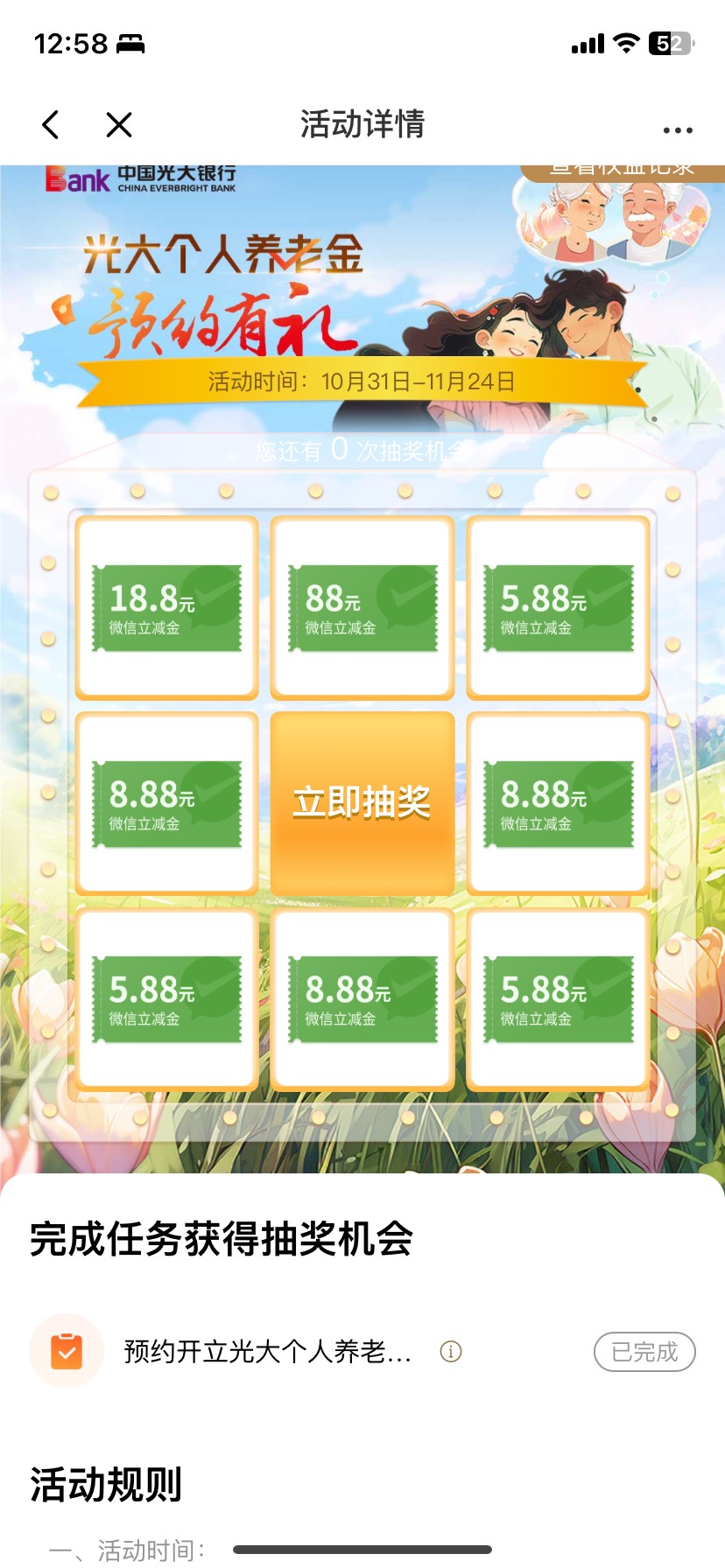 光大银行横幅知养老享未来,养老预约开户抽奖 小伊 11-11 光打银行APP预约养老金抽奖18.8 上一篇快,有水,助力没啥用,前一两次中奖率高,助力直接❌了就行下一篇娇娇 成都数字人民币 首页轮播月月好礼 我中5.8