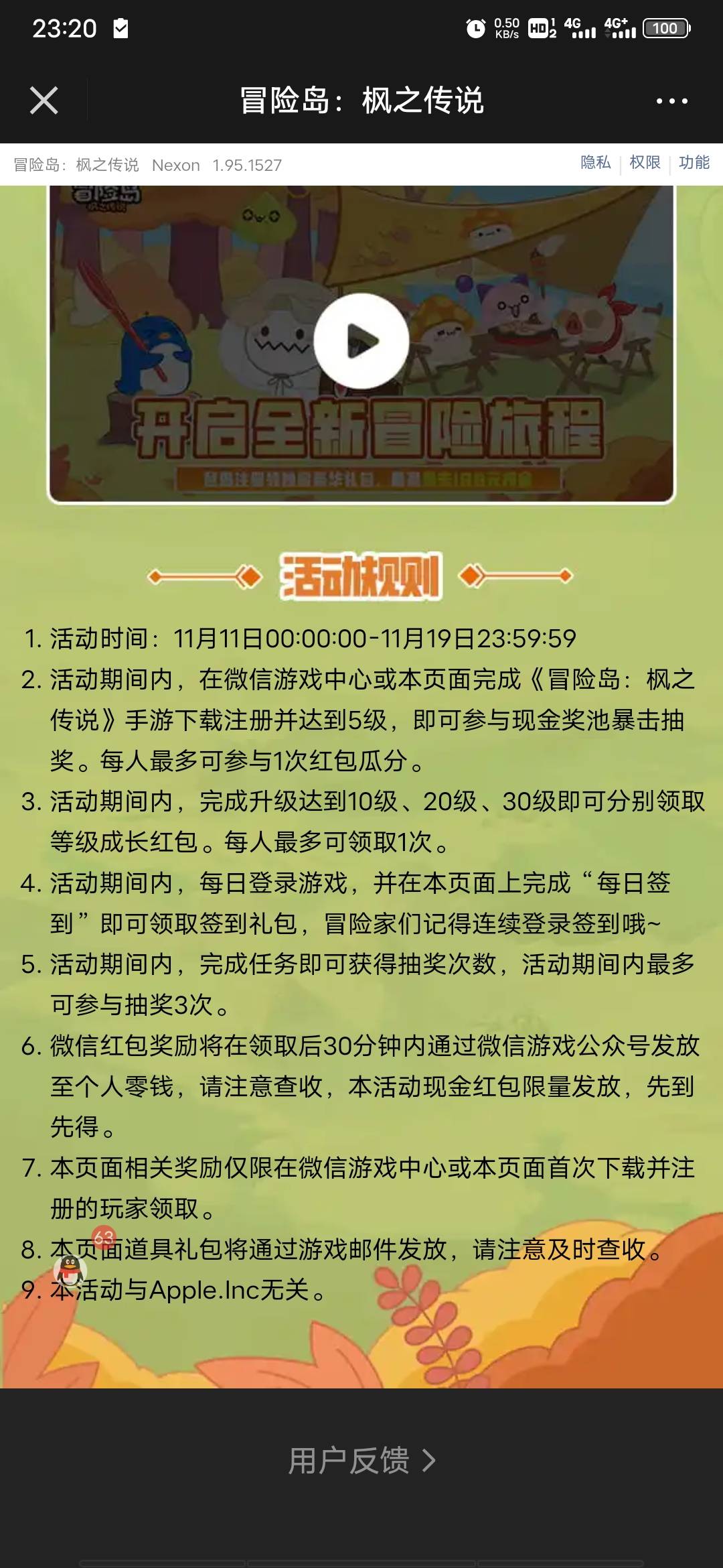 腾讯游戏冒险岛11月11号游戏链接 小伊 11-12 冒险岛注册3 20级4 6的没了链接 无头https://game.weixin.qq.com/cgi-b ... ct¬iceid=107009418 上一篇上千套绝美PPT模板下一篇领完红包赶快去使用,凌晨就过期了,双十一活动到此结束,我们双