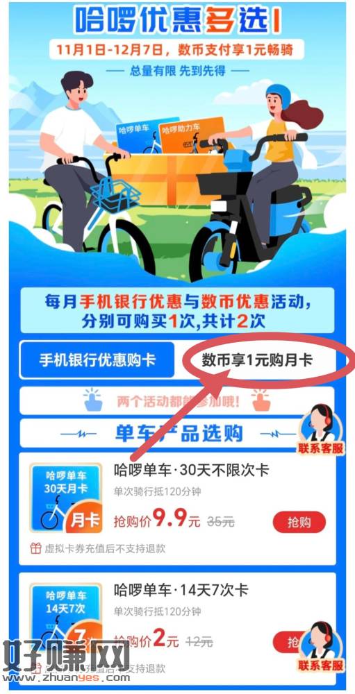9.9元购哈啰单车月卡,数币支付1元购月卡。