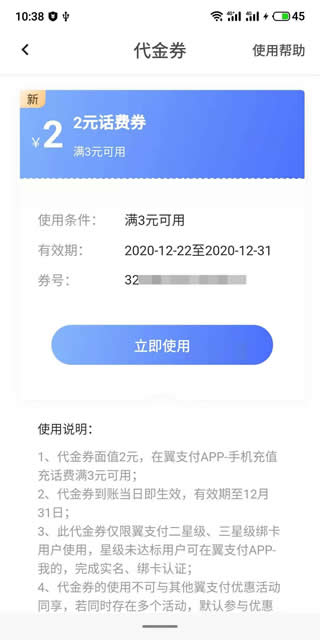 兑换成功后在翼支付App-- 我的--代金券可查看和使用--充值的时候选择自定义输入3元