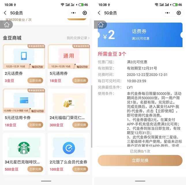 活动限电信翼支付老用户参加,3金豆可以兑换2元话费券