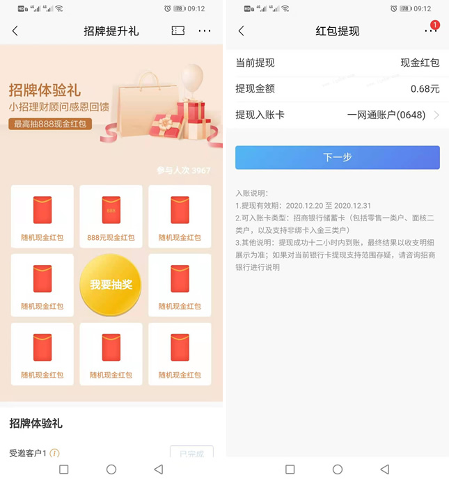 最高得888元现金红包,必得随机红包,可提现一网通账户