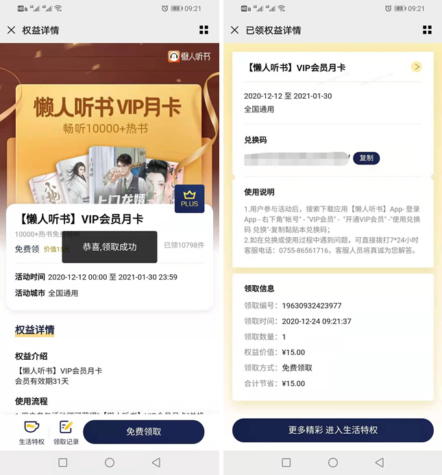 领取后在懒人听书App--右下角账号--VIP会员--开通VIP会员--使用兑换码兑换即可