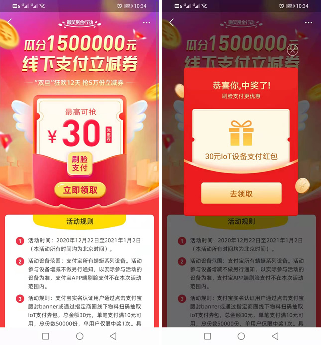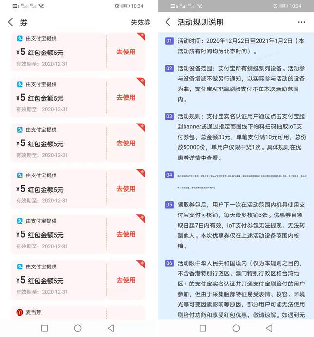 含6张满10-5元线下刷脸支付红包,红包使用可在卡券中查看