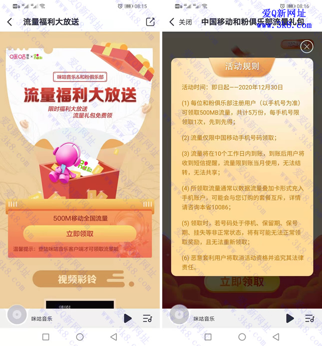 需要流量的移动用户可以去领取一下,需下载咪咕音乐App去领取