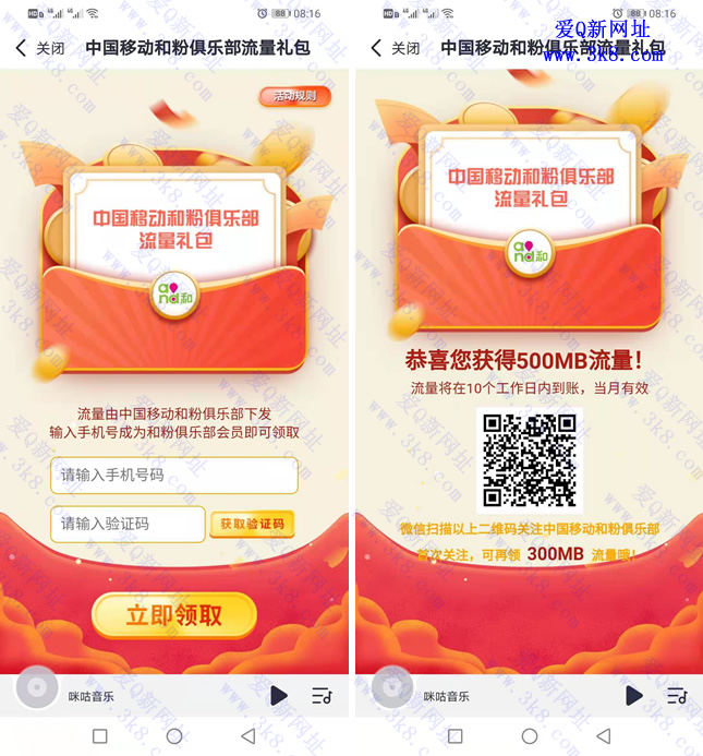 移动免费领500M月包流量秒到 需下载咪咕音乐App