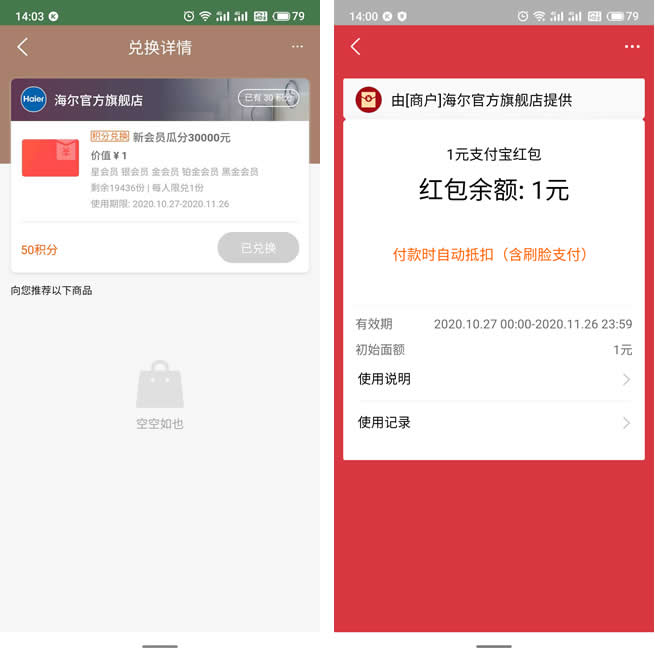 淘宝海尔官方旗舰店30积分兑换1元支付宝红包