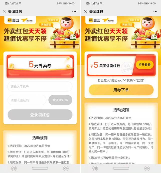 美团外卖每天领取5元外卖红包 满5元可用 每天限量